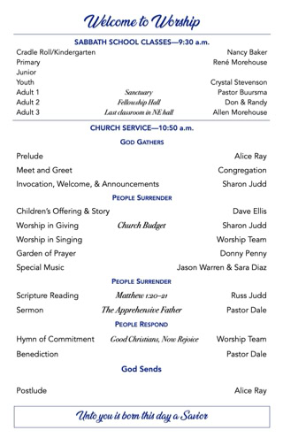 To preview this bulletin, click on either the right (>) or left (<) arrow icons to move to the next or previous page. (Please note that the current week’s bulletin will be published after the church service).